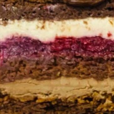 Šokoladinis biskvitas, šokoladinis musas, traškutis, juodųjų serbentų – vyšnių įdaras, vanilinis nemalakas.